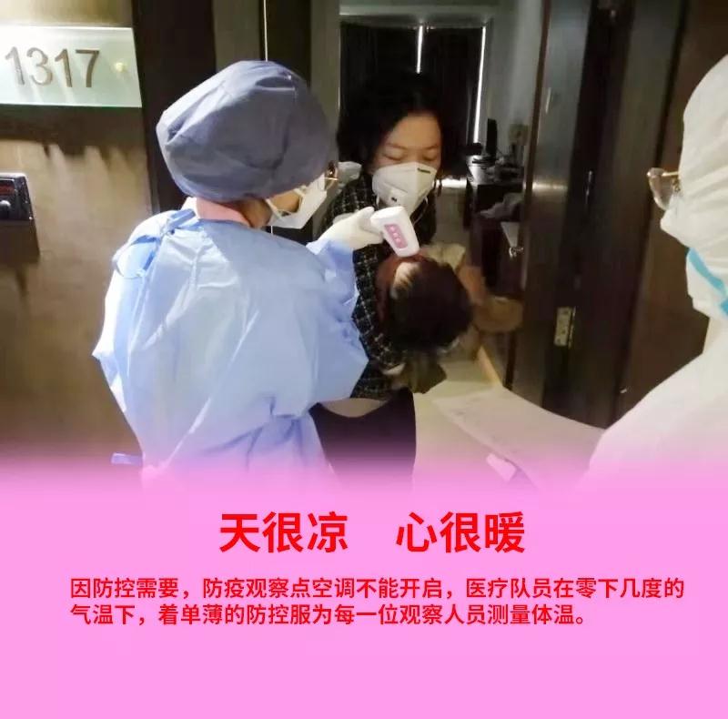 這支醫(yī)療隊(duì)由3名醫(yī)生、5名護(hù)士組成,分別是房武寧、張曉敏、王婧3位醫(yī)生;護(hù)士為白容容、陳蕓、王亞馨、燕瑞娥、田橋。身穿不透氣的防護(hù)服,醫(yī)護(hù)人員時(shí)時(shí)刻刻與時(shí)間拼耐心、與疫情變化拼細(xì)心。留觀人員中有16名70歲以上的老人,6名3歲以下的兒童。他們體質(zhì)較弱,需要更多的關(guān)懷與呵護(hù)。護(hù)士王亞馨每天要在樓上往返7、8趟為他們測(cè)體溫、安撫情緒?!拔乙矔r(shí)常想念家人,春節(jié)沒法和他們一起過年?,F(xiàn)在,這里的老人和孩子就是我的家人。”正說著,豆大的汗珠順著她的眼睫毛滑落。即便超負(fù)荷工作著,她也從未喊過苦叫過累。