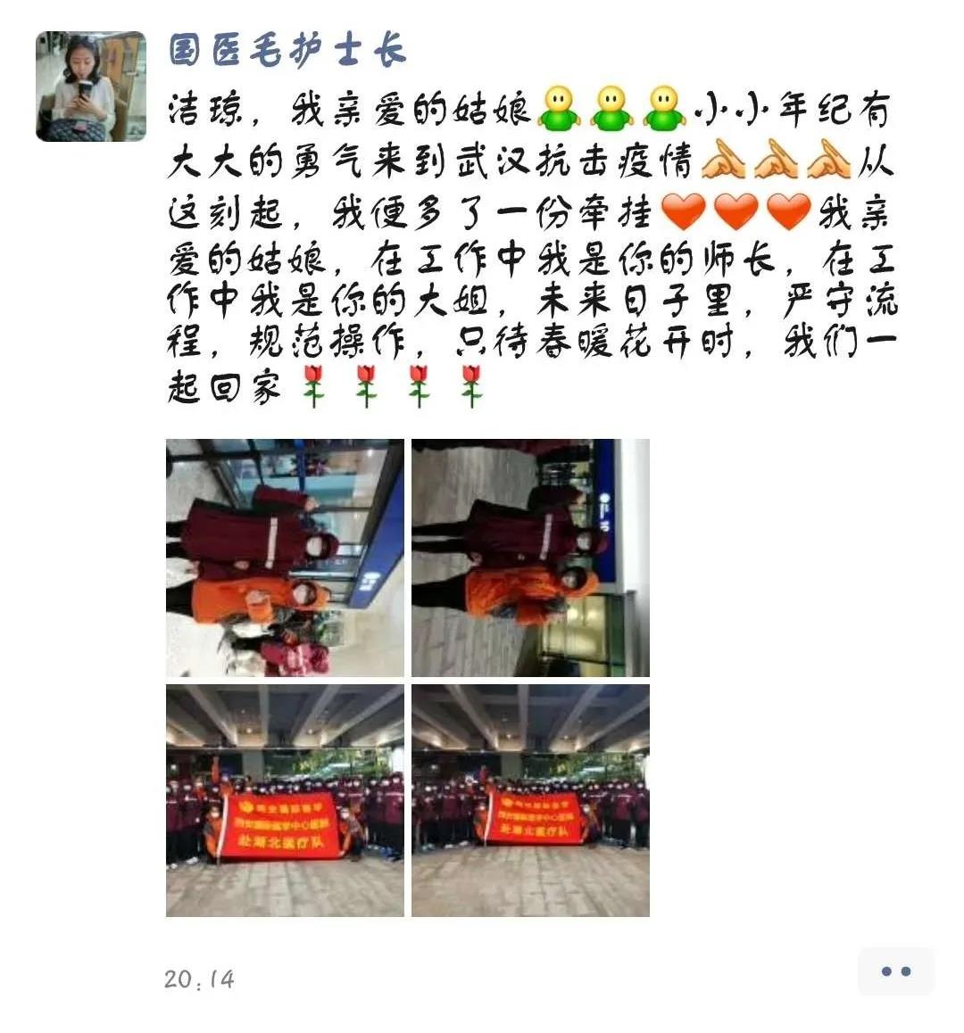 “潔瓊,我親愛(ài)的姑娘,小小年紀(jì)有大大的勇氣來(lái)到武漢,抗擊疫情,從這刻起,我便多了一份牽掛,我親愛(ài)的姑娘,在工作中我是你的師長(zhǎng),在生活中我是你的大姐姐,未來(lái)日子里,嚴(yán)守流程,規(guī)范操作,只待春暖花開(kāi)時(shí),我們一起回家?!边@些話中充滿了護(hù)士長(zhǎng)對(duì)潔瓊的鼓勵(lì)、疼惜、牽掛以及對(duì)抗擊疫情必勝的信心,我親愛(ài)的戰(zhàn)士們,加油,我們與你同在。
