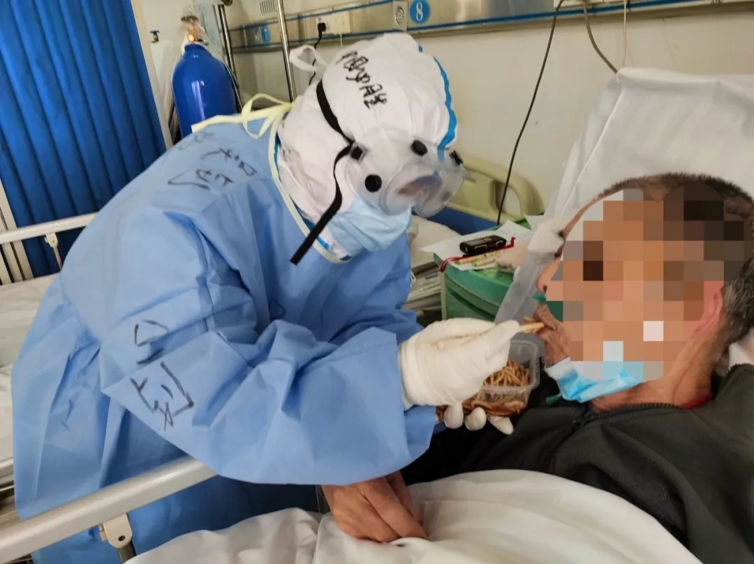 印象最深的是一個八十多歲的老爺爺在我們所管的病區(qū)住院,他除了新冠肺炎還有高血壓、偏癱的癥狀。他的老伴也八十多歲了,一直在這守護(hù)著他,照顧著他,老奶奶耳朵也有點背,嗓門很大,經(jīng)常問我們藥怎么吃,我們都耐心的解釋。我的搭檔吳釗要給別的患者泡牛奶,都是找這個熱心的老奶奶幫忙試水的溫度。我們幫隔壁床的患者翻身,換床單,她也過來給我們幫忙,還時常說我們好。有時候要扶老爺爺起來,我們要給幫忙,她總是不要我們幫忙,讓人很心疼。我想,老奶奶沒日沒夜的伺候著老伴,應(yīng)該是害怕失去吧,希望老爺子趕快好起來。