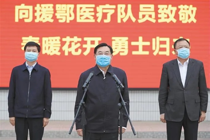 胡和平代表省委、省政府和全省人民,歡迎白衣戰(zhàn)士們平安凱旋,向仍然堅(jiān)守在湖北的醫(yī)療隊(duì)員表示誠(chéng)摯慰問(wèn),向醫(yī)務(wù)人員家屬的理解和支持表示衷心感謝。胡和平指出,習(xí)近平總書(shū)記十分關(guān)心關(guān)愛(ài)一線醫(yī)務(wù)人員,黨中央、國(guó)務(wù)院作出了一系列安排。希望大家在接下來(lái)的這段時(shí)間里安心休養(yǎng),調(diào)整好身心和精神狀態(tài)。休整結(jié)束后,要繼續(xù)保持在這次抗疫戰(zhàn)斗中展現(xiàn)出的良好精神風(fēng)貌,立足崗位、努力工作,為奪取疫情防控和實(shí)現(xiàn)經(jīng)濟(jì)社會(huì)發(fā)展目標(biāo)任務(wù)雙勝利再立新功。