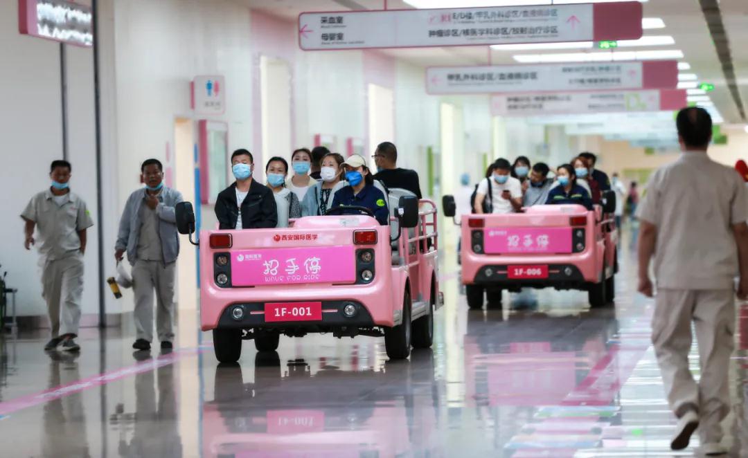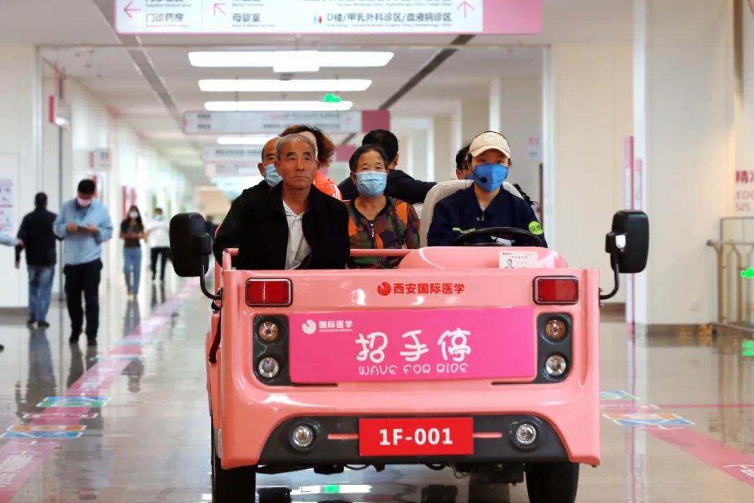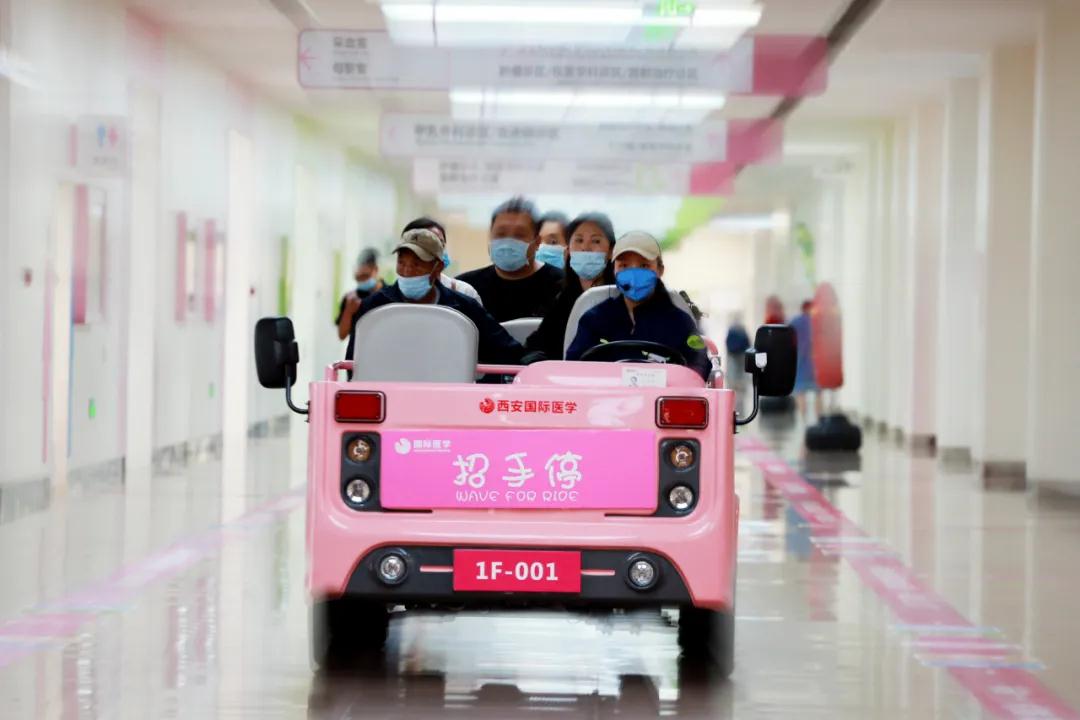 6月8日,在西安國際醫(yī)學(xué)中心醫(yī)院醫(yī)療大樓內(nèi),多輛“招手?!彪娖寇囌┧笤谧呃壤铮铀突颊吆歪t(yī)護(hù)人員。