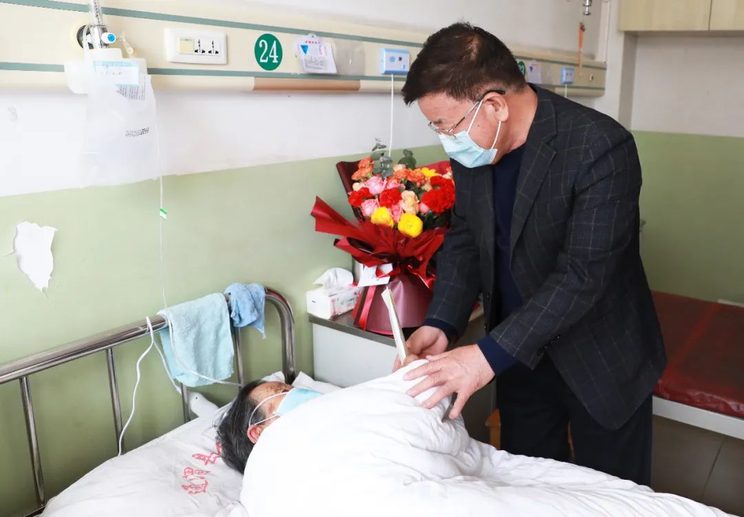 你在前方打仗,我在后方保障!醫(yī)院指派專人與醫(yī)療隊(duì)家屬一一對接,詳細(xì)了解前方親屬們實(shí)際困難,搭建與隊(duì)員家屬的聯(lián)系平臺(tái),第一時(shí)間了解并解決家屬們的困難。3月18日,王志峰總經(jīng)理、腫瘤醫(yī)院院長南克俊教授等一行6人,驅(qū)車300多公里遠(yuǎn)赴甘肅省通渭縣人民醫(yī)院,看望85歲,有著60年黨齡,身患重病的李斌同志母親,為老人送上了慰問品及慰問金。