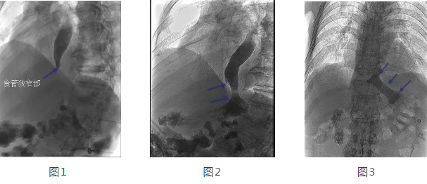 在韓國(guó)宏教授的帶領(lǐng)下,專家團(tuán)隊(duì)經(jīng)多方面評(píng)估后,決定在DSA下為劉大爺行食管造影 食管支架置入術(shù)。術(shù)中透視可見(jiàn)食管中上段擴(kuò)張明顯,食管下端賁門口明顯狹窄,造影劑淤積,呈線性緩慢進(jìn)入胃腔(見(jiàn)圖1),經(jīng)過(guò)準(zhǔn)確定位后,釋放食管支架,再次造影可見(jiàn)造影劑經(jīng)支架順利進(jìn)入胃腔(見(jiàn)圖2)。2天后再次造影見(jiàn)食管支架完全打開,位置正常,造影劑可順利通過(guò)支架(見(jiàn)圖3)。
