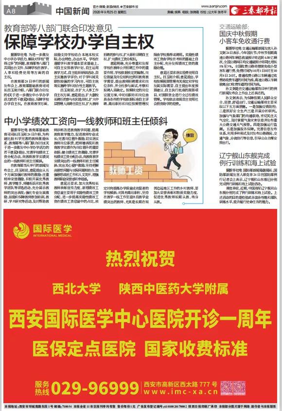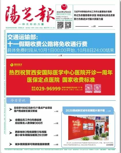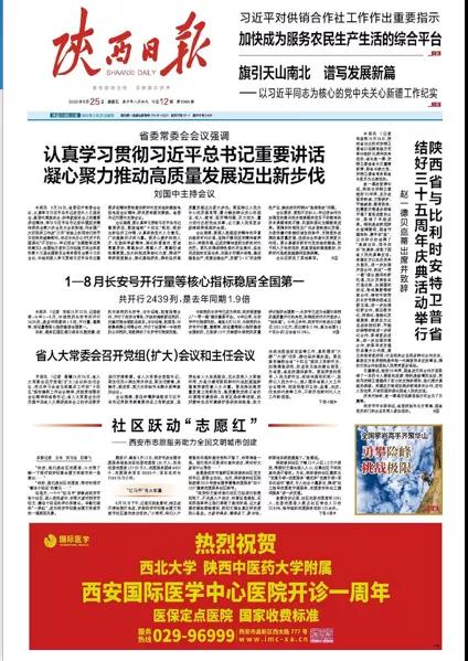 2020年9月25日,在西安國際醫(yī)學(xué)中心醫(yī)院一周歲生日之際,陜西日?qǐng)?bào)、西安晚報(bào)、華商報(bào)、三秦都市報(bào)、陽光報(bào)分別刊文送上生日祝福。