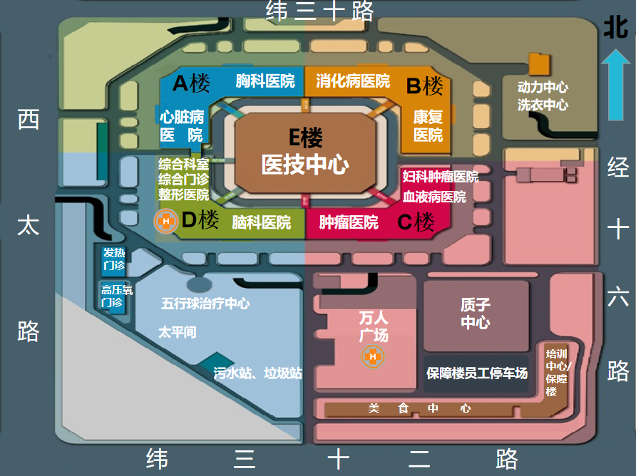 腦科醫(yī)院、整形醫(yī)院采用綠色;心臟病醫(yī)院、胸科醫(yī)院采用天藍(lán)色;消化病醫(yī)院、骨科醫(yī)院、康復(fù)醫(yī)院、兒童醫(yī)院采用暖黃色;腫瘤醫(yī)院、婦科腫瘤醫(yī)院、血液病醫(yī)院則采用粉色。綠藍(lán)黃粉的交叉使用,代表醫(yī)學(xué)各學(xué)科之間交叉與融合。L型單體建筑三層以下為各??崎T診、急診、重癥病區(qū);四層以上為住院部。駝色的醫(yī)技大樓,內(nèi)設(shè)麻醉手術(shù)中心、影像診療中心、檢驗(yàn)中心、消毒供應(yīng)中心、放射治療中心、核醫(yī)學(xué)科等。