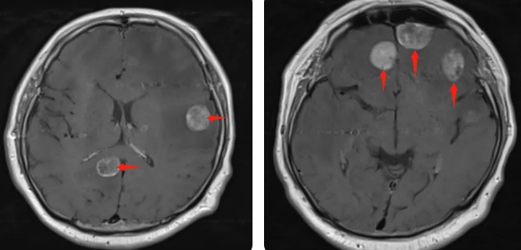 無獨有偶,60歲的左肺癌患者石先生,在外院接受了手術治療,結果術后10月出現(xiàn)腫瘤腦轉移,頭部增強MRI顯示:顱內(nèi)多發(fā)占位性病變伴水腫,接二連三的重擊讓石先生出現(xiàn)表情淡漠,沉默寡言,絕食等抑郁癥狀,VMAT放療技術與心理疏導雙管齊下,3周的治療后顱內(nèi)轉移病灶顯著縮小,部分甚至消失,困擾石先生的頭痛、頭暈癥狀也不復存在,石先生重拾對生活的希望,也對未來的治療充滿信心。