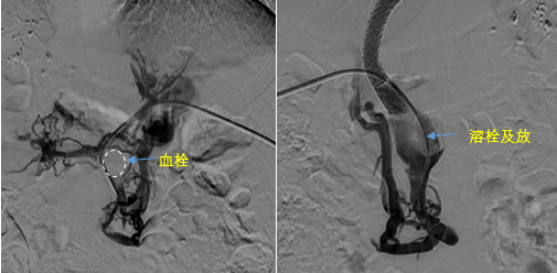 見(jiàn)此情形,韓國(guó)宏教授憑借豐富的臨床經(jīng)驗(yàn)很快調(diào)整了策略,在超聲診療中心的協(xié)助下進(jìn)行門(mén)靜脈右支穿刺,并進(jìn)行造影,看到目標(biāo)血管后,韓國(guó)宏教授用“明修棧道,暗渡陳倉(cāng)”的方法,讓來(lái)自脾臟和胃腸的血流終于暢通的回流到了肝靜脈。通過(guò)血流的沖刷以及抗凝溶栓藥物的作用,幾日后復(fù)查造影發(fā)現(xiàn)門(mén)靜脈血栓已逐漸變小,不會(huì)對(duì)回流到肝臟的血流產(chǎn)生大的阻礙作用,門(mén)靜脈的壓力顯著減小,患者再次出血的幾率也隨之降低。幾經(jīng)周折,這顆“定時(shí)炸彈”終于被拆除,李女士和她的家人多年來(lái)心里的石頭也終于落地。