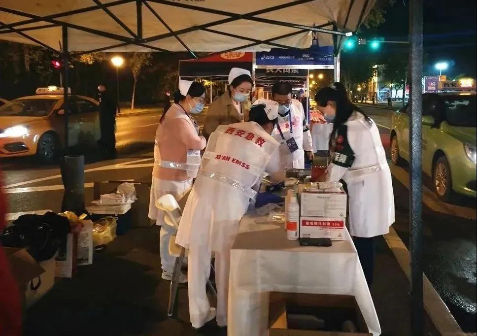 凌晨4點,醫(yī)療保障組分成3隊,分乘4輛車從醫(yī)院統(tǒng)一出發(fā)前往賽事現(xiàn)場。到達指定地點后,團隊立刻按照前期演練分工進行相關準備工作。7點30分,2020西安國際馬拉松正式鳴槍開跑,現(xiàn)場保障人員及時響應,積極救助受傷參賽選手,專業(yè)的技術和溫馨的言語,讓受傷的的選手們感到溫暖。