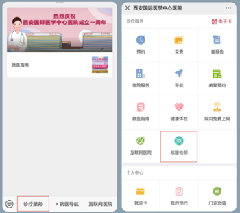 為方便患者進行核酸檢查,我院開通核酸檢測網(wǎng)上預(yù)約,并免掛號費用,患者可通過西安國際醫(yī)學中心醫(yī)院服務(wù)號進行預(yù)約和自助繳費。