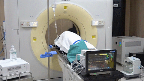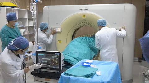 經(jīng)過放射治療中心陸軍主任的細致準備與精準定位,屈女士的射頻治療開始了?;颊卟扇∽髠?cè)臥位,麻醉醫(yī)生立即進行靜脈全麻。在CT引導下,醫(yī)生手中的“消融針”,按照既定路線“穿引”,快速、準確地插入右肺病灶部位,啟動射頻機器進行了精準的消融,右肺局部癌細胞一下子就被超高溫成功滅活了!經(jīng)CT掃查,無血氣胸;患者生命體征平穩(wěn)。2個小時后,屈女士就下地活動了。
