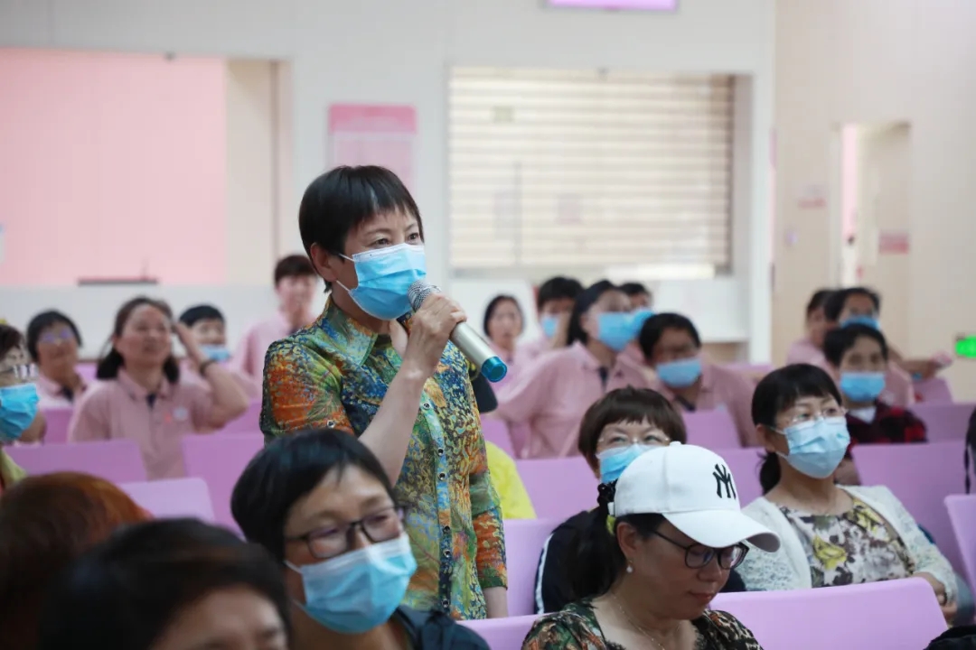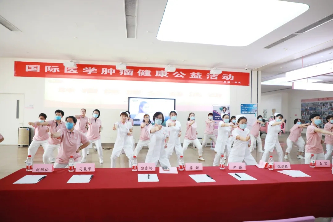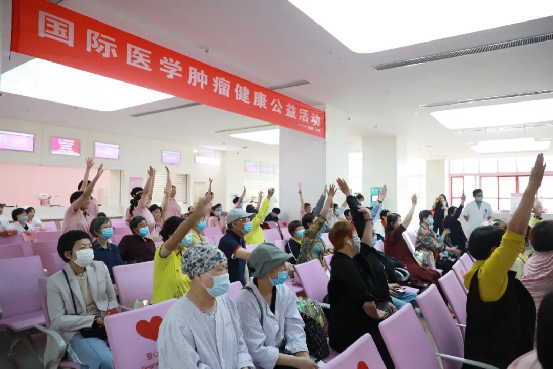 腫瘤一病區(qū)的醫(yī)護人員和志愿者們共同演練了一段八段錦,隨后的健康知識問答和歌曲快閃環(huán)節(jié)將活動氛圍推向高潮,大家爭先恐后地舉手搶答,現(xiàn)場問答也促進了對于腫瘤防治、康復(fù)知識的推廣。最后,大家合唱歌曲“相信我們會創(chuàng)造奇跡”,積極、歡樂的氛圍縈繞不息?;顒幼詈螅﹀痹洪L、劉樹松教授和張俊美醫(yī)生對患者的提問進行了耐心、細致的解答。