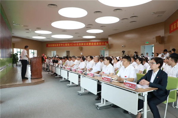 5月27日,西安國(guó)際醫(yī)學(xué)中心醫(yī)院舉行JCI認(rèn)證授牌儀式暨總結(jié)表彰大會(huì)。聯(lián)合委員會(huì)國(guó)際部總裁兼首席執(zhí)行官PaulaWilson ,聯(lián)合委員會(huì)國(guó)際部中國(guó)區(qū)主任、JCI評(píng)審(北京)有限公司副總經(jīng)理任暉,聯(lián)合委員會(huì)國(guó)際部JCI認(rèn)證組組長(zhǎng)孔雅雀,華潤(rùn)JCI研究院執(zhí)行院長(zhǎng)酈忠,西安國(guó)際醫(yī)學(xué)投資股份有限公司總裁劉瑞軒、副董事長(zhǎng)王愛(ài)萍、副總裁孫文國(guó)、副總裁王杲、孫義寬,西安國(guó)際醫(yī)學(xué)中心醫(yī)院院長(zhǎng)尹強(qiáng)、總經(jīng)理王志峰等領(lǐng)導(dǎo),各專科醫(yī)院院長(zhǎng)、主任、護(hù)士長(zhǎng)以及職工代表參加。