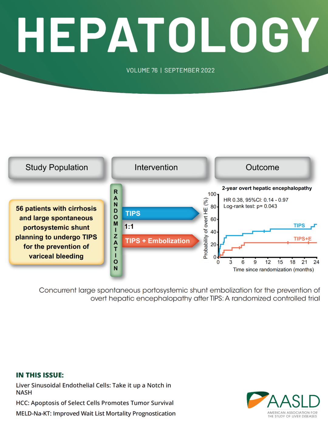 新近,西安國際醫(yī)學(xué)中心醫(yī)院消化病醫(yī)院韓國宏教授團(tuán)隊(duì)的一項(xiàng)隨機(jī)對照試驗(yàn)“經(jīng)頸靜脈肝內(nèi)門體靜脈分流術(shù)(TIPS)聯(lián)合自發(fā)性門體分流封堵預(yù)防術(shù)后顯性肝性腦病”的論著被最新一期的Hepatology雜志(IF=17.29,JCR:Q1)遴選為9月份封面文章(圖1)。該研究顯示TIPS聯(lián)合粗大分流道封堵能夠有效降低TIPS術(shù)后顯性肝性腦病的發(fā)生率,且不增加門靜脈高壓、分流道功能障礙和其他不良事件的并發(fā)癥風(fēng)險(xiǎn)[1]。