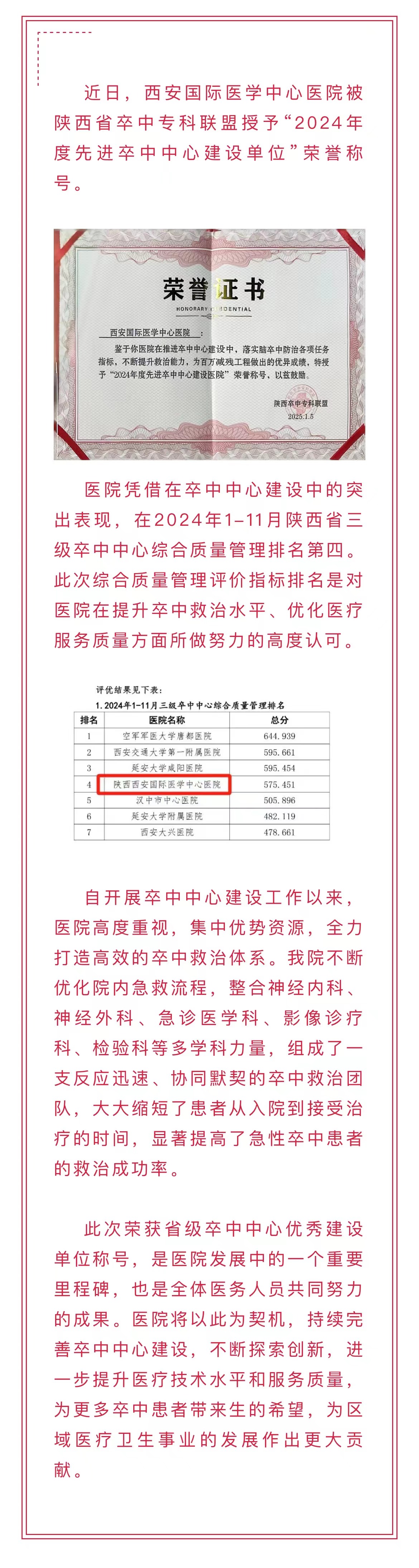 • 國內(nèi)首家高分通過JCI認證的醫(yī)院 西安國際醫(yī)學中心醫(yī)院為國內(nèi)首家高分通過JCI認證的醫(yī)院,該稱號由國際醫(yī)療機構(gòu)認證聯(lián)合委員會頒布。