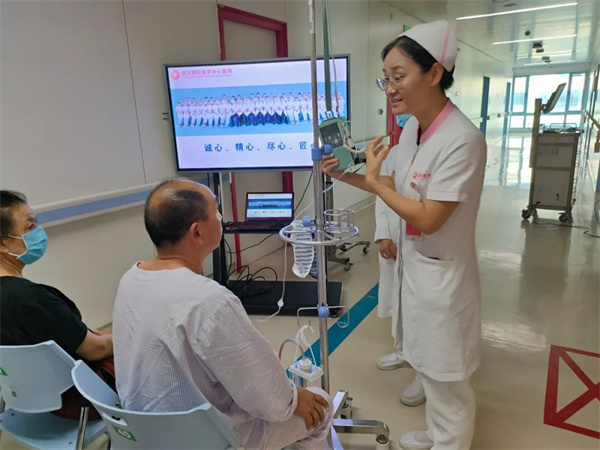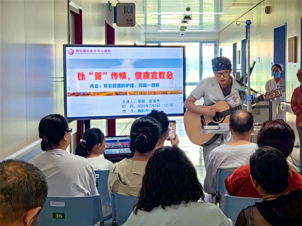 宣教會(huì)現(xiàn)場還充滿了溫暖的音符。崔智杰護(hù)士巧妙地將音樂療愈融入護(hù)理關(guān)懷,為在場患者深情彈唱了《隱形的翅膀》和《月亮代表我的心》。他表示:“醫(yī)護(hù)人員和家屬的心愿是一樣的,都期盼患者早日康復(fù)。希望音樂的感染力能為他們?cè)鎏響?zhàn)勝病魔的力量?!备杪暡粌H傳遞了關(guān)懷,也進(jìn)一步拉近了護(hù)患距離,增強(qiáng)了患者積極面對(duì)疾病的心理建設(shè)。